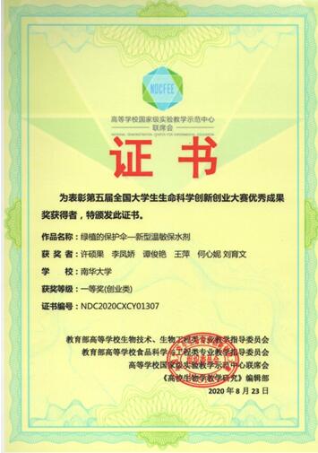 近日,由教育部高等学校生物技术、生物工程类专业教学指导委员会,教育部高等学校食品科学与工程类专业教学指导委员会,高等学校国家级实验教学示范中心联席会,《高校生物学教学研究》(电子版)编委会,全国大学生生命科学创新创业大赛组织委员会联合主办的第五届全国大学生生命科学创新创业大赛圆满落下帷幕。太阳成集团tyc33455cc“生物医用水凝胶大学生创新团队”成员许硕果、李凤娇、谭俊艳、王萍、何心妮和刘育文等同学完成的《绿植的保护伞——新型温敏保水剂》项目荣获创业组一等奖,指导教师刘阳博士获得指导教师一等奖。