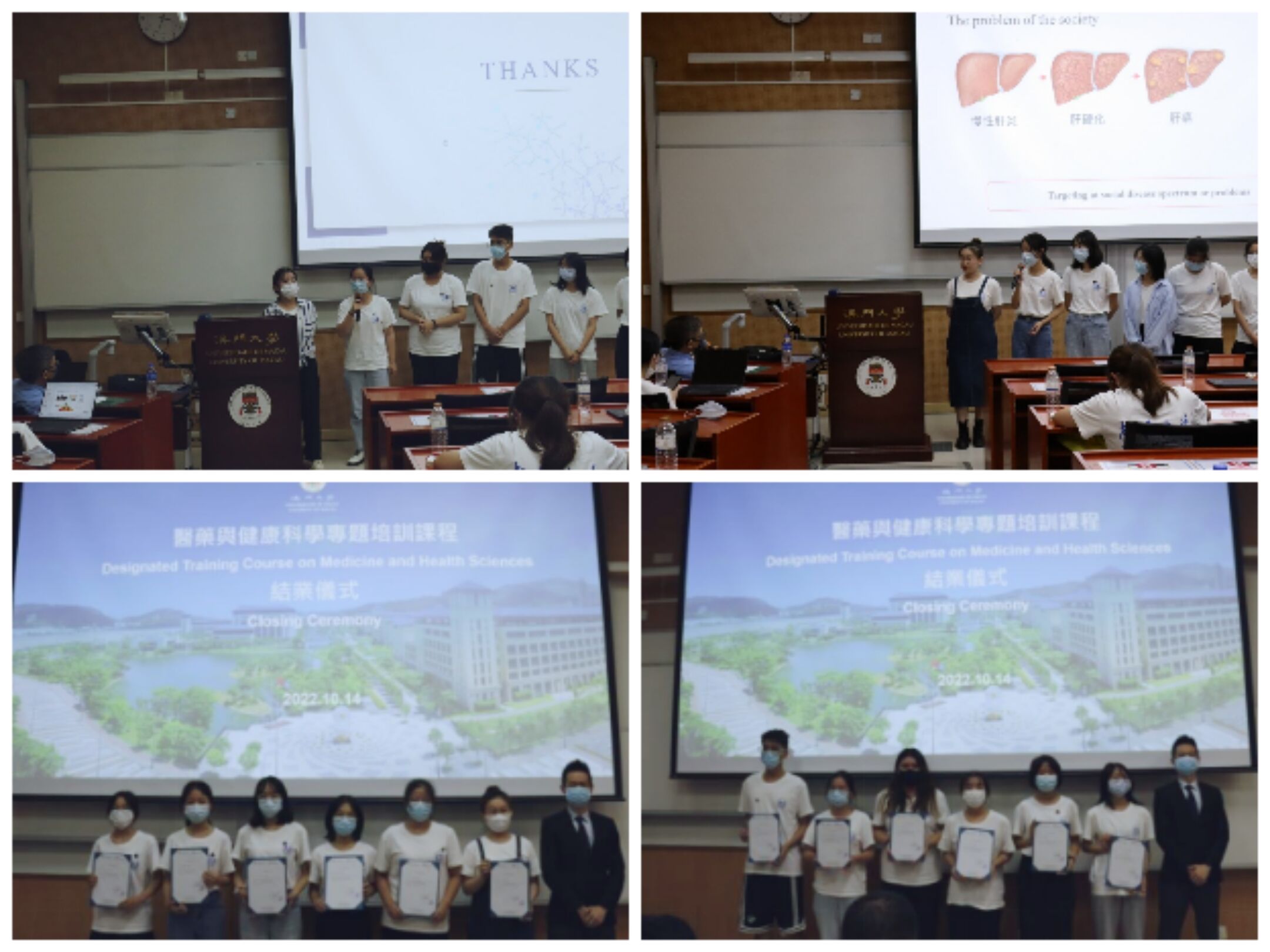 10月9日-10月16日是为期一周的线下研学活动。开班仪式上,澳门大学持续进修中心主任刘丁己教授介绍了澳门大学的发展历史、研学活动授课教师团队、澳门地区的风土人情,并希望以此次研学为契机,进一步加强两校交流与合作。在此期间,学员们有幸聆听到澳门大学健康科学学院多位资深教授的全英文授课。分别是黄冠豪教授的“基因生物信息学基础与前沿介绍”、路嘉宏教授(系太阳成集团tyc33455ccwww校友)的“癌症及神经退行性疾病中的自噬溶酶体途径”、黄植富教授的“生物医学科技:生命科学与健康的奥秘”以及吴蔼琳教授的“中医药在大健康产业中的应用与发展”等等。同学们认真听讲,积极思考,抓住与教授们面对面用英文交流的机会,积极提问,展现我院学生风采。通过聆听教授的讲座,学员们对医药健康的不同领域有了进一步的了解,也有了对未来职业发展方向的参考。