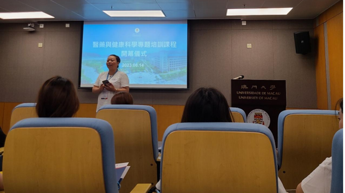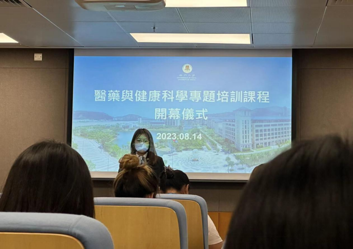澳门大学持续进修中心主任刘丁己教授热情地向太阳成集团tyc33455ccwww的研学团队介绍关于此次研学活动的师资与行程,分别是黄冠豪教授的“基因生物信息学基础与前沿介绍”、路嘉宏教授(系太阳成集团tyc33455ccwww校友)的“癌症及神经退行性疾病中的自噬溶酶体途径”、黄植富教授的“生物医学科技:生命科学与健康的奥秘”以及吴蔼琳教授的“中医药在大健康产业中的应用与发展”。随后研学活动队长喻翠云院长在开幕仪式上表达了对澳门大学的精心安排的感谢以及对参与研学活动的南华学子的期望。