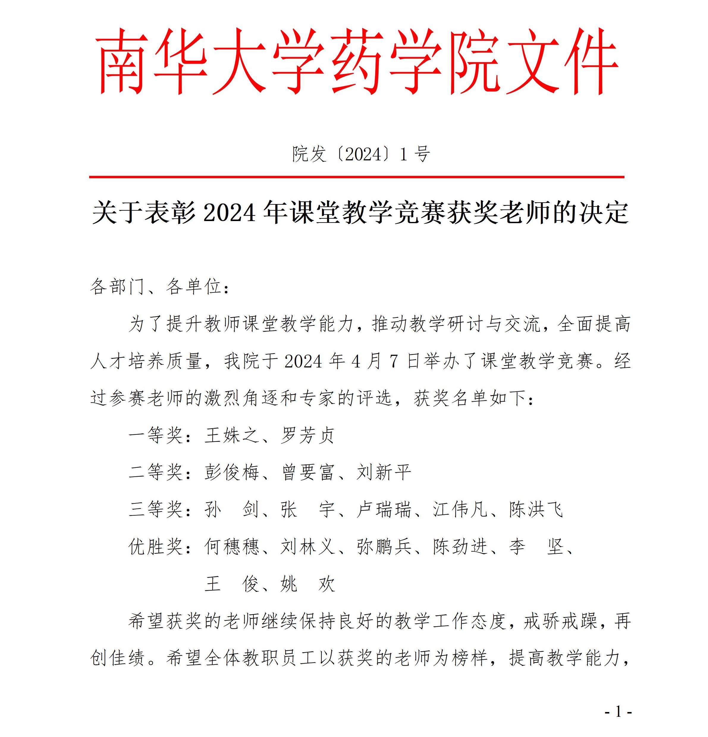 太阳成集团tyc33455cc表彰2024年课堂教学竞赛获奖老师的决定