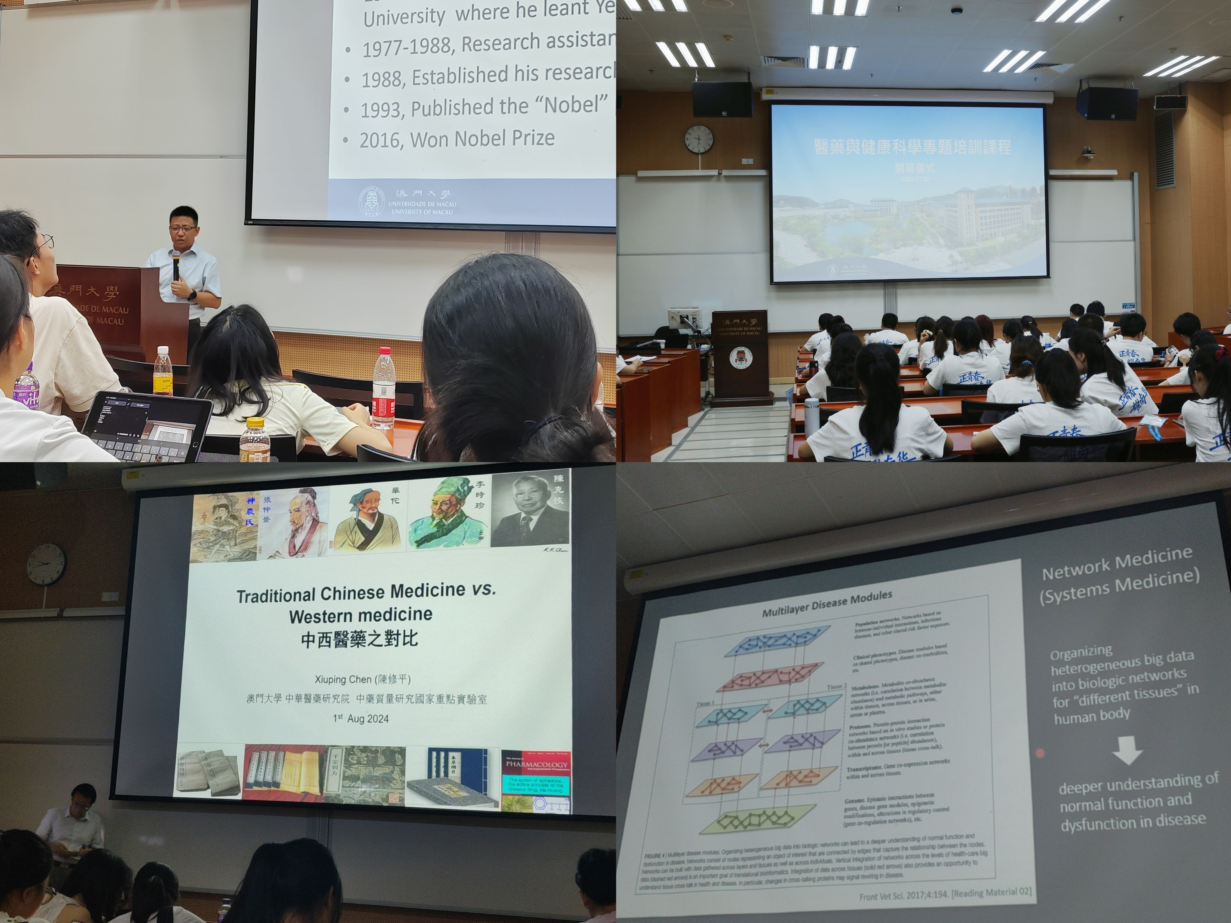 线下研学期间,澳门大学多位知名教授为学生们带来了精彩的学术讲座:黄冠豪教授介绍了“基因与生物信息学基础与前沿”,路嘉宏教授探讨了“癌症和神经退行性疾病中的自噬溶酶体途径”,潘全威教授介绍了“精准医学与大数据:革命与商机”,陈修平教授则分享“中西药的比较”。讲座内容不仅前沿且贴近实际,极大地启发学生兴趣和思考。