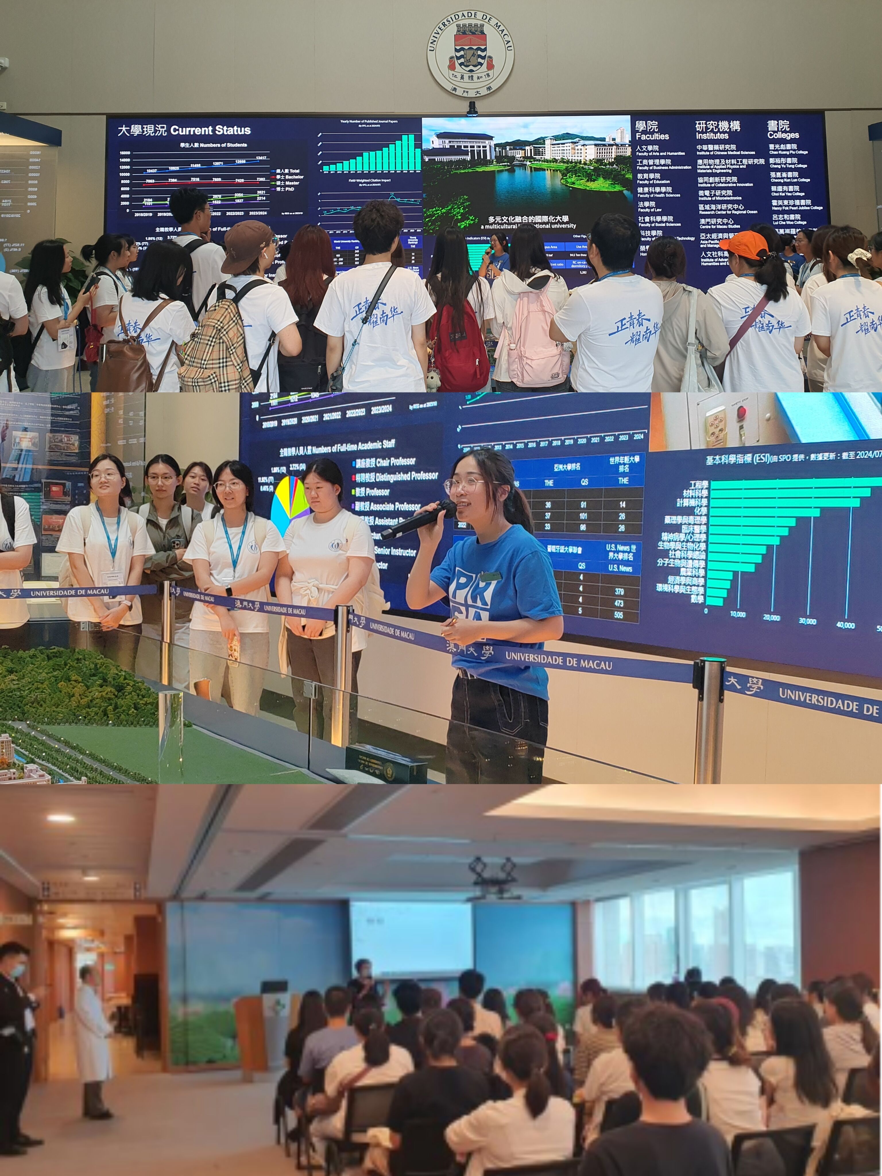 研学团跟随澳门大学志愿者参观校园以及澳门地区最大的私立医院--镜湖医院。实地考察活动让学生们近距离感受到了科研的魅力和医疗技术的进步,加深了对医药与健康科学的理解和认识。