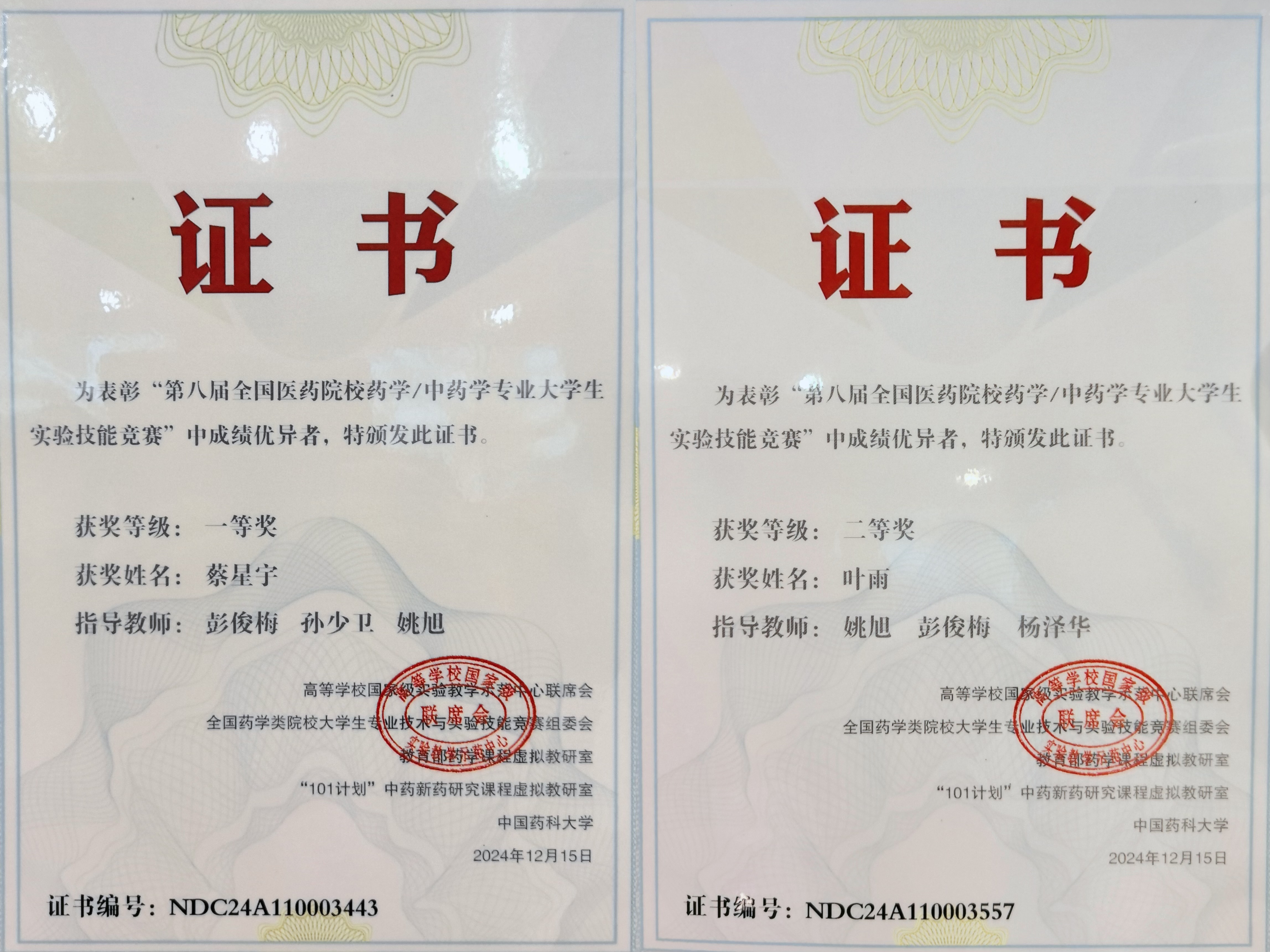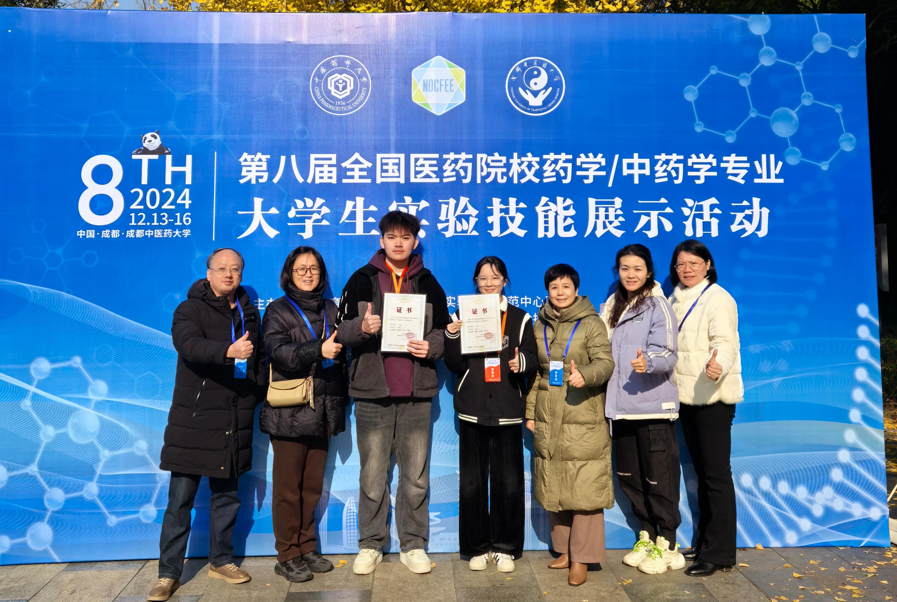 2024年12月15日,“第八届全国医药院校药学/中药学专业大学生实验技能竞赛”决赛在成都中医药大学落下帷幕。经过激烈的角逐,太阳成集团tyc33455cc2021级药学专业的蔡星宇和叶雨同学发挥出色,分别获得一等奖和二等奖,创下历年来最佳赛绩。