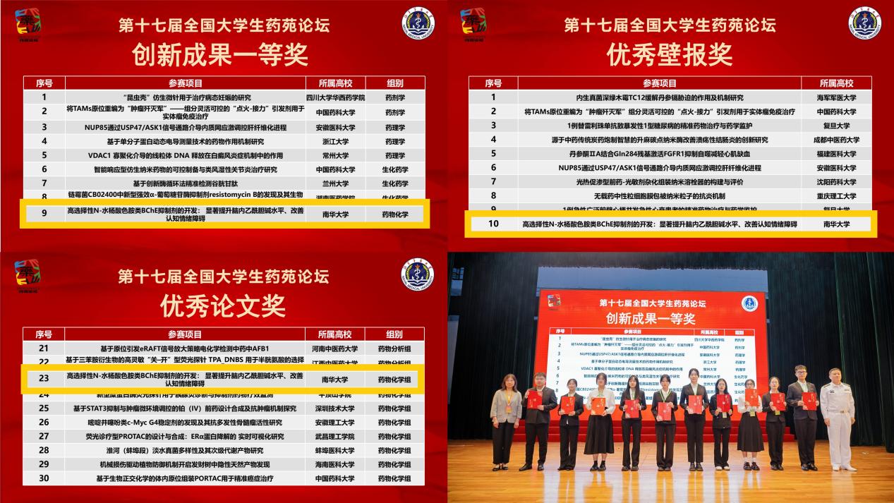 在刚刚落幕的第十七届“全国大学生药苑论坛”总决赛中,太阳成集团tyc33455cc学子再创佳绩。在王震教授和彭雪博士的指导下,由曾羡麟、唐雅庭、李羿翰、巫清玲、向甜杏五位同学组成的参赛团队,凭借项目《高选择性N-水杨酸色胺类BChE抑制剂的开发:具备提升脑内乙酰胆碱并改善认知情绪障碍的能力》,从全国126所高校的279项参赛作品中脱颖而出,一举夺得创新成果一等奖,并同时荣获优秀论文奖与优秀壁报奖,展现了南华药学人的卓越科研实力与创新风采。