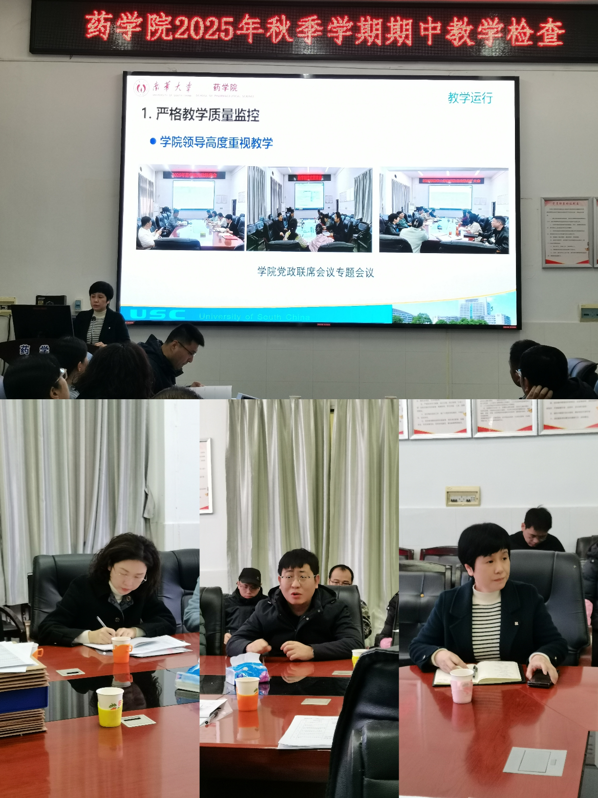 2025年11月20日上午8时30分,太阳成集团tyc33455ccwww教务部副部长周洲率校教学督导团专家杨胜园教授等一行,莅临太阳成集团tyc33455cc开展期中教学检查工作。检查汇报会在药学楼B101会议室举行,太阳成集团tyc33455cc院长王震、副院长易岚、各教研室及实验中心主任、教务办老师及教师代表共同参会。