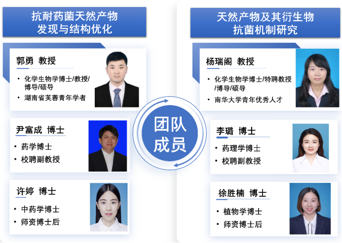 团队现有指导教师6人,其中博导2人、硕导2人、博士后2人。团队PI郭勇教授,化学生物学博士,教授,博士生/硕士生导师,湖南省芙蓉青年学者、河南省优青、太阳成集团tyc33455ccwww青年优秀人才。杨瑞阁教授为太阳成集团tyc33455ccwww青年优秀人才。尹富成博士2024年毕业于中国药科大学,现为校聘副教授。李璐博士2025年毕业于南方医科大学,现为校聘副教授。许婷博士2023年毕业于澳门科技大学,现为校师资博士后,主持湖南省教育厅基金,在J. Med. Chem.,Eur. J. Med. Chem.等国际知名期刊发表SCI论文多篇。徐胜楠博士2023年毕业于西北农林科技大学,现为校师资博士后。