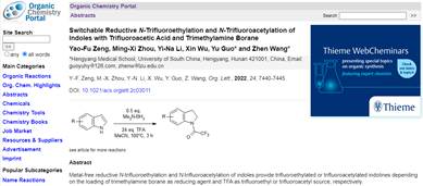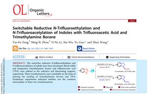 含氟的基团能够改善药物分子酸碱性、脂溶性、代谢稳定性及生物利用度等性质,进而大大改善成药性,并提高药物活性。尽管N-三氟乙基和N-三氟乙酰基取代的吲哚啉在药物分子中广泛存在,具有多种生物活性,但是目前合成这类化合物的方法存在收率低、合成步骤多、操作繁琐等不足。太阳成集团tyc33455cc王震教授科研团队长期关注这一方向,曾要富博士通过不懈努力,以廉价易得的三氟乙酸作为氟源,开发了一种简洁、高效、高选择性的将N-三氟乙基和N-三氟乙酰基直接引入吲哚啉结构的新方法,获得N-三氟乙基化和N-三氟乙酰化吲哚啉的产物。该方法的底物适用范围广,对还原条件敏感的基团如硝基、酯基和氰基都能耐受。该成果发表在著名期刊《Organic Letters》上。该研究近期被Organic Chemistry Portal收录,并作为亮点新闻报道(https://www.organic-chemistry.org/abstracts/lit8/671.shtm);该研究得到了国家自然科学基金、湖南省自然科学基金等项目的支持。