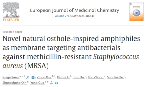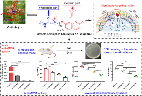 题为“Novel natural osthole-inspired amphiphiles as membrane targeting antibacterials against methicillin-resistantStaphylococcus aureus(MRSA)”的研究论文。在该研究中,杨瑞阁和郭勇教授课题组以中药活性物质蛇床子素为先导,设计并制备了一系列新型蛇床子素两亲物6a-6ad。两亲性蛇床子素衍生物6aa对金黄色葡萄球菌和10株临床分离的MRSA具有最优异的抗菌作用,MICs值为1 ~ 2μg/mL,与临床用药万古霉素相当。此外,6aa具有快速杀菌而不容易产生耐药性、低毒性、良好的膜选择性和良好的血浆稳定性的优点。机理研究表明6aa具有良好的膜靶向能力以结合细菌细胞膜上的磷脂酰甘油(PG),从而破坏细胞膜并导致细胞内ROS增加以及蛋白质和DNA泄漏,并加速细菌死亡。值得注意的是,体内活性结果显示6aa显示出比万古霉素更强的抗MRSA功效,以及MRSA诱导的促炎细胞因子(包括TNF-α和IL-6)的显著减少。鉴于6aa令人印象深刻的体外和体内抗MRSA功效,这使其成为抗MRSA感染的潜在候