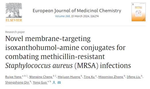 题为“Novel membrane-targeting isoxanthohumol-amine conjugates for combating methicillin-resistantStaphylococcus aureus(MRSA) infections”的研究论文。在该研究中,杨瑞阁和郭勇教授课题组通过模拟抗菌肽(AMPs)的结构和膜靶向特性,成功制备了一系列异黄腐醇-胺共轭物作为抗菌剂。经过生物活性评估,得到了化合物E2,该化合物对金黄色葡萄球菌和临床MICs = 0.25-1μg/mL),优于万古霉素,而且具有低溶血和良好的膜选择性。此外,E2还具有快速杀灭细菌、不易产生耐药性、相对较低的细胞毒性和良好的膜选择性等特点。细胞毒性低,血浆稳定性好。机理研究表明,E2能通过与磷酸酶的特异性结合来破坏细菌膜。通过与细菌膜上的磷脂酰甘油特异性结合来破坏细菌膜,从而导致细胞内ROS升高和渗漏。细胞内ROS升高,DNA和蛋白质泄漏,最终杀死细菌。值得注意的是,E2与相同剂量的万古霉素相比,E2具有良好的体内安全性和更好的体内疗效,因此有可能成为是一种潜在的抗菌剂,可用于治疗MRSA感染。这些发现将为进一步开发利用天然异黄腐醇对抗耐药细菌提供重要启示。