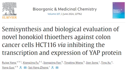 题为“Semisynthesis and biological evaluation of novel honokiol thioethers against colon cancer cells HCT116 via inhibiting the transcription and expression of YAP protein”的研究论文。在该研究中,杨瑞阁和郭勇教授课题组联合郑州大学张赛扬教授通过对中药厚朴中的活性物质和厚朴酚进行结构优化,制备了一系列带有1,3,4-噁二唑部分的新型和厚朴酚硫醚,并评价了它们对三种消化系统肿瘤细胞的抗癌活性。生物学评价显示和厚朴酚衍生物3k对HCT116细胞表现出最佳的抗增殖活性,IC50值为6.1μmol/L,优于阳性药物5-氟尿嘧啶(IC50:9.63±0.27mol/L)。构效关系(SARs)表明,–(4-NO2)Ph、3-吡啶基、–(2-F)Ph、–(4-F)Ph、–(3-F)Ph、–(4-Cl)Ph和–(3-Cl)Ph基团的引入有利于增强标题和厚朴酚硫醚的抗癌活性。进一步研究发现和厚朴酚硫醚3k能很好地抑制结肠癌细胞HCT116的增殖,使细胞停滞在G1期并诱导细胞死亡。此外,初步的机制研究表明,3k直接抑制YAP蛋白的转录和表达,而不激活Hippo信号通路。因此,和厚朴酚硫醚3k可被深入开发用于