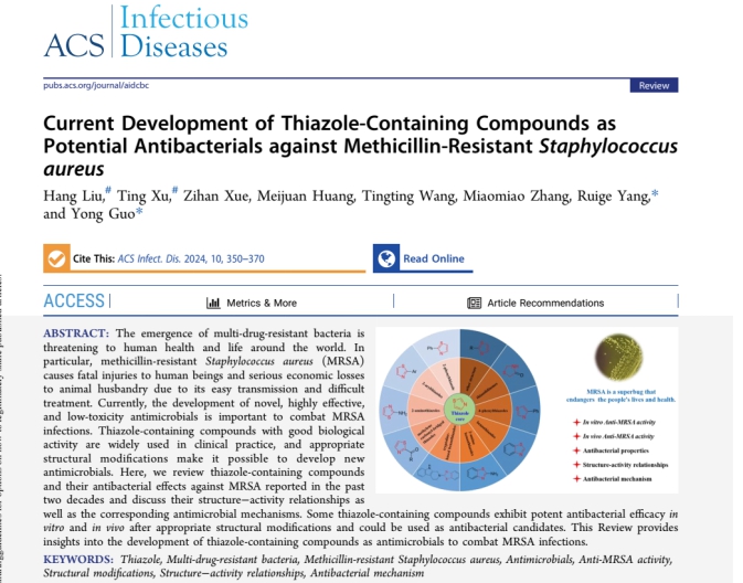 题为“Current Development of Thiazole-Containing Compounds as Potential Antibacterials against Methicillin-ResistantStaphylococcus aureus”的综述性论文。在该研究中,杨瑞阁和郭勇教授课题组回顾了过去二十年中报道的含噻唑化合物及其对MRSA的抗菌效果,并讨论了它们的结构-活性关系以及相应的抗菌机制。一些含噻唑的化合物经过适当的结构修饰后,在体外和体内均表现出强大的抗菌功效,可用作抗菌候选化合物。本综述深入探讨了开发含噻唑化合物作为抗菌剂以抗击MRSA感染的问题。
