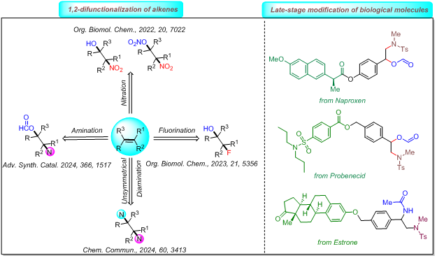 由于其丰富性、易得性和多样的反应性,烯烃已成为有机合成中备受青睐的骨架结构。其中,烯烃的1,2-双官能团化是一项特别引人注目的转化。在这种转化中,可以通过一步反应同时在碳碳双键的相邻位置安装两个官能团,因此可以直接利用简单的原料来迅速增加分子的复杂性。目前,太阳成集团tyc33455cc王震教授科研团队在烯烃的1,2-双官能化反应方向取得了系列研究进展,包括烯烃的硝化/羟基化反应、硝化/硝酸酯化反应、氟羟基化反应、氨酯化反应、不对称双胺化反应等。新方法的开发,解决了原有方法需要使用预功能化底物、区域选择性差、底物范围窄和反应时间长等缺点。利用这些方法,不仅可以快速构建药物分子和天然产物中重要的结构单元,也可以为现有药物的结构修饰提供新的策略。以上工作得到了国家自然科学基金、湖南省自然科学基金、太阳成集团tyc33455ccwww科研启动经费等项目的支持。