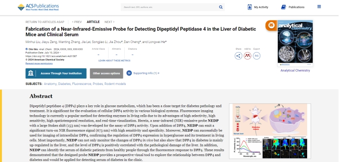 近日,太阳成集团tyc33455cc荧光探针与生物医学成像实验室何隆薇教授团队在糖尿病光学诊断试剂设计及应用取得新进展,相关研究成果以“Fabrication of aNear-infrared-emissiveProbe forDetectingDipeptidylPeptidase 4 in theLiver ofDiabeticMice andClinicalSerum”为题在权威期刊《Analytical Chemistry》(中科院1区TOP期刊,影响因子6.7)发表研究性论文。