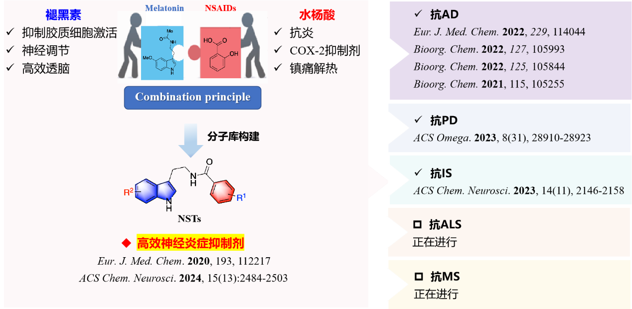 2020年,王震教授团队创造性的将具有抗炎活性的水杨酸色胺片段拼合,成功构建了超150个NSTs小分子库,已成功将其应用于治疗神经退行性疾病(AD、PD及IS等),并从中成功发现3-5个具有开发前景的临床候选化合物。