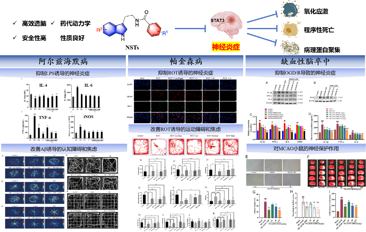 近日,本团队彭雪博士与王震教授深入研究发现NSTs通过抑制神经炎症调控氧化应激水平、阻止程序性死亡(铁死亡、凋亡和焦亡)及改善病理性蛋白质聚集等;能高效透脑,在小鼠脑组织中药物浓度达到0.97± 0.21 μg/g;具有良好的药代动力学性质和体内安全性(LD50> 1000 mg/kg);可改善AD和PD小鼠/大鼠学习记忆、探索和运动能力;减轻IS小鼠的脑梗死体积和神经功能缺损,达到IS一线用药丁苯肽疗效。初步机制研究揭示NSTs可能通过抑制STAT3的转录、表达和磷酸化发挥抗神经炎症作用,是极富NDDs治疗潜力的神经炎症抑制剂。