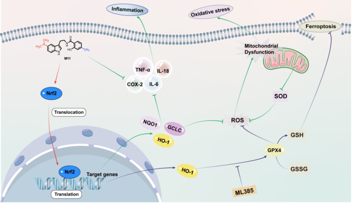 近日,本团队彭雪博士与王震教授在缺血性卒中治疗研究中发现,新型N-水杨酰色胺衍生物(NSTs)M11具有协同高效抗氧化、抗炎、抗铁死亡和抗凋亡作用,在这些方面均优于临床一线药物依达拉奉(EDV)。M11体内外活性均显示出十分优异的药效与药物代谢动力学性质:对CI/RI的神经细胞具有显著的保护作用(cell survival = 92.66 ± 0.91%)且安全无毒(IC50> 100 μM);可显著减少IS小鼠的梗死体积,改善神经功能缺陷,达到EDV疗效;作为中枢神经系统治疗潜力分子,M11能高效透脑,具有良好的药代动力学性质和体内安全性(LD50> 500 mg/kg)。初步机制研究揭示M11有效激活Nrf2及其下游靶基因HO-1/NQO1/GCLC/GPX4,对CI/RI发挥强大的神经保护作用,成为极富潜力的抗IS候选药物,具有临床转化潜力。
