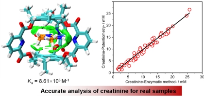 离子选择性电极广泛应用于临床诊断,检测能力依赖于离子载体的选择性。然而,对于肌酐这一肾功能评估的关键生物标志物,高选择性的离子载体非常有限。该团队针对肌酐分子的结构特点,设计并合成了一个可以高效结合肌酐阳离子的内修饰分子笼。使用这种分子笼制备的离子选择性电极可以实现肌酐的快速准确检测。该成果发表在英国皇家化学会旗舰期刊Chemical Science(Chem. Sci.,2024,15, 14791-14797)。