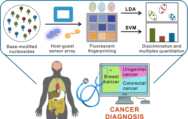 RNA核苷碱基修饰是基因表达多层级调控的关键机制之一,目前已发现超过170种修饰类型。研究表明,特定修饰核苷(如甲基化、乙酰化)与癌症发生发展密切相关,且会通过尿液等体液排泄,成为潜在的癌症诊断标志物。然而由于修饰核苷的多样性且结构高度相似,使修饰核苷的快速准确检测仍然面临挑战。针对此问题,太阳成集团tyc33455ccwww王力立/杨留攀教授团队基于课题组前期发展的四内酰胺大环构建了荧光传感器阵列,并成功应用于RNA修饰核苷多重鉴别和定量分析。这一策略有望为精准医疗中癌症的高通量筛查提供新方法。相关研究结果发表于中科院一区TOP期刊ScienceChinaChemistry(IF=10.4)。