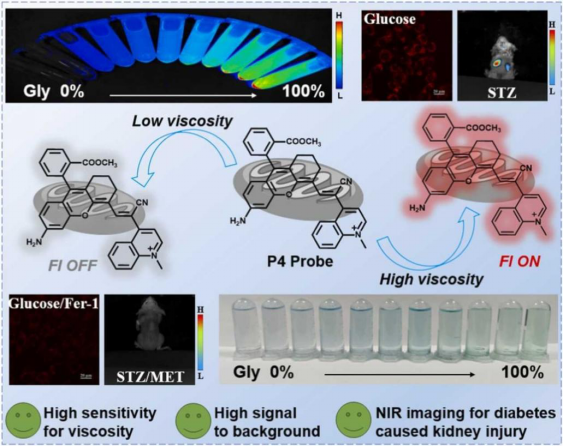 糖尿病肾损伤已成为导致肾脏疾病的重要原因之一。早期发现和干预可以有效延缓肾脏疾病的发展。粘度作为细胞微环境的关键参数,在维持线粒体功能和细胞稳态中起着关键作用,其失调与糖尿病肾损伤的发病机制密切相关。然而,很少有报道使用荧光探针来确定糖尿病肾损伤过程中的线粒体粘度变化。在此,该团队使用“渐进优化”策略开发了一种基于半花菁的近红外荧光探针P4,能够对肾细胞和体内线粒体粘度变化进行靶向成像。P4探针对粘度具有高灵敏度和选择性,在具有高线性关系的高粘度环境中表现出约146倍的信号增强。P4的荧光量子产率从PBS(低粘度)中的< 0.001增加到90%甘油(高粘度)中的0.12。此外,P4探针显示出优异的线粒体定位效率,能够在糖尿病肾损伤进展和治疗干预期间实时监测线粒体粘度变化。P4探针在糖尿病肾损伤小鼠模型中检测到肾脏粘度变化,与健康组照相比,信号强度增加了1.5倍。使用P4探针,首次在高葡萄糖诱导的肾细胞损伤模型中观察到粘度变化与铁死亡相关。这项工作将为更深入地了解肾脏疾病的粘度变化提供有意义的工具,并有望促进肾脏疾病的早期诊断和治疗。相关研究成果以“Fabricating a mitochondrial viscosity-activated fluorescent probe for highly sensitive imaging of kidney injury in vivo”为题发表在国际权威期刊《Sensors and Actuators B: Chemical》(中科院一区TOP期刊,影响因子8.0);本项工作由团队硕士生郑显贵和助理研究员张红帅博士为共同第一作者完成,太阳成集团tyc33455ccwww附属南华医院程丹研究员和太阳成集团tyc33455cc何隆薇教授为本文通讯作者。