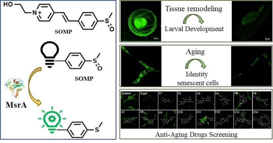 细胞增殖与衰老是密切相关的生物学过程,在组织重塑、应激反应及衰老相关疾病中扮演着双重角色。然而,细胞衰老的动态复杂性使得传统检测方法难以实现活细胞内生物标志物的原位精准监测,导致关键生物学信息丢失。研究表明,MsrA活性降低会缩短秀丽隐杆线虫、果蝇、小鼠等多种模式生物的寿命,而提高其表达水平则可延缓衰老并促进健康寿命。因此,MsrA被视为调控细胞衰老的关键分子靶点。为此,研究团队设计了由苯乙烯基吡啶鎓染料和亚砜基团构成的特异性MsrA荧光探针SOMP。该探针具有超高灵敏度(检测限达8.9 ng/mL)、优异的选择性(受MsrB2/B3干扰极小)和低细胞毒性的优势,适用于细胞长期观测。基于SOMP的卓越性能,该研究实现了多项创新应用:1)原位监测细胞增殖与幼体发育:首次在活细胞及模式生物中动态可视化MsrA活性变化。2)精准评估衰老进程:在多种衰老模型中成功追踪MsrA的活性变化,为衰老机制研究提供新方法。3)高通量抗衰老药物筛选:利用SOMP首次发现姜黄素的抗衰老作用可能与MsrA介导的氧化还原信号相关,为天然抗衰老药物开发提供新线索。该研究开发的SOMP探针突破了传统检测技术的局限,为细胞衰老的原位分析、衰老相关疾病机制探索及抗衰老药物开发提供了高效、可靠的新工具,有望为精准医学与衰老相关领域提供无创原位可视化新方法。该成果以“A Novel Visual Perspective for Tracking of Larval Development, Aging and Anti-Aging Drugs Screening by Fluorescent Sensing MsrA”为题发表于国际权威期刊《Analytical Chemistry》(中科院一区TOP期刊,影响因子6.8);该研究由团队博士研究生曾佳玉、太阳成集团tyc33455cc硕士研究生杨婷作为共同第一作者完成,太阳成集团tyc33455ccwww附属第一医院周佳主任、附属南华医院程丹研究员和太阳成集团tyc33455cc何隆薇教授为通讯作者。
