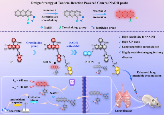 糖尿病作为一种全球高发的临床代谢性疾病,其长期高血糖状态可引发多器官并发症,但肺部作为糖尿病靶器官的病理机制(如NADH/NAD⁺失衡诱导氧化应激)长期缺乏实时监测工具。传统NADH探针因灵敏度低(检测限μM级)、组织穿透性差(可见光成像)及非特异性干扰等问题,难以实现活体深部组织(如肺部)的精准检测。为此,本研究提出一种基于串联反应策略的近红外(NIR)荧光试剂NBON,通过结合苯硼酸靶向基团(邻近二醇酯化交联)与半菁染料荧光基团(NIR发射波长721 nm),实现了NADH的高灵敏度检测(检测限45 nM)及肺部特异性富集。在细胞层面,NBON成功揭示了高糖环境下NADH的动态波动及依帕司他(EPS)通过抑制醛糖还原酶恢复氧化还原平衡的机制;在动物模型中,该探针实时成像链脲佐菌素(STZ)诱导的糖尿病小鼠肺部NADH异常累积,并评估了二甲双胍/EPS的治疗效果;此外,NBON还可区分肺转移瘤与原位肿瘤组织,辅助术中精准切除。这一研究不仅填补了NADH活体动态监测的技术空白,首次在分子层面阐明EPS缓解糖尿病肺病的抗氧化机制,更为糖尿病并发症诊疗、药物开发及肿瘤精准手术提供了通用化工具,推动了代谢性疾病研究与临床转化的深度融合。该成果以“Tandem reaction-powered near-infrared fluorescent molecular reporter for real-time imaging of lung diseases”为题发表在国际权威期刊《Chemical Science》(中科院1区TOP期刊,影响因子7.6);太阳成集团tyc33455cc和附属南华医院为本论文通讯单位,团队成员硕士生胡琰、助理研究员张红帅博士和硕士生丁一腾为论文的共同第一作者,太阳成集团tyc33455ccwww附属南华医院程丹研究员和太阳成集团tyc33455cc何隆薇教授为论文的共同通讯作者。