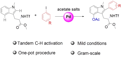 近日,研究团队以芳基碘及醋酸盐为修饰试剂,通过过渡金属钯催化的串联C-H活化实现了色氨酸衍生物C2-芳基化及C4-乙酰氧化。该修饰方法展示出较高的修饰效率及较广的底物适用性,可在克级规模下制备双功能化的非天然氨基酸前体,相关研究结果发表于《Organic Chemistry Frontiers》。论文第一作者为中山大学博士研究生刘家田,李坚博士为通讯作者,太阳成集团tyc33455cc为第一单位。