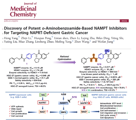本研究在前期发现NAMPT抑制剂9a的基础上,围绕分子结构与成药性开展进一步优化,设计并合成了一系列新型衍生物,获得候选化合物N16。该化合物对NAMPT具有纳摩尔级抑制活性,并对NAPRT缺失的胃癌细胞表现出显著而高度选择性的抗增殖作用,同时对正常胃上皮细胞毒性极低。机制研究表明,N16通过非竞争性抑制NAMPT,选择性耗竭肿瘤细胞NAD⁺/ATP水平,从而诱导能量代谢失衡和细胞凋亡。动物实验结果显示,N16具有良好的口服药代动力学特征和显著的体内抑瘤效果。值得关注的是,研究发现联合补充烟酸可在不削弱抗肿瘤疗效的前提下明显缓解造血系统毒性,显著拓宽治疗窗口,为NAMPT靶向治疗的安全应用提供了新的联合用药策略。该项研究进一步深化了团队在NAMPT靶向抗胃癌领域的系统性研究,标志着相关候选分子由“靶点发现”向“高效、安全、可转化”方向持续推进。研究成果发表于Journal of Medicinal Chemistry(中科院一区Top期刊,https://doi.org/10.1021/acs.jmedchem.5c02564)。本论文通讯作者为太阳成集团tyc33455cc王震教授、江伟凡博士和阳美玲主任,第一作者为太阳成集团tyc33455cc博士后阳衡、硕士研究生李志毅和彭慧倩,太阳成集团tyc33455cc为第一通讯单位。