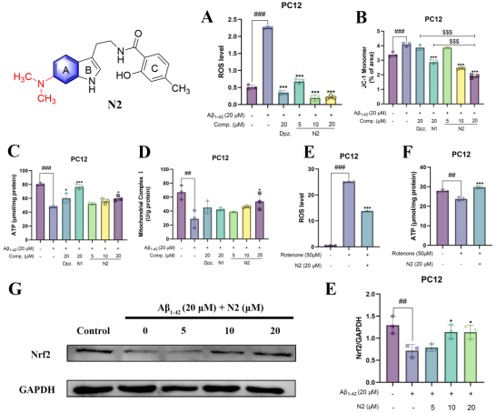 化合物N2是NSTs中筛选出的最优化合物,我们以AD(第一大神经退行性疾病)为切入点进行分子机制探索。结果表明,化合物N2可上调Nrf2并恢复MCI活性以改善线粒体功能从而治疗AD。在细胞水平上,化合物N2不仅能直接改善线粒体功能——表现为显著提升MCI活性、恢复线粒体膜电位并增加ATP生成,还能降低细胞内ROS、炎症因子TNF-α和IL-6水平,有效缓解线粒体功能障碍引发的氧化应激和神经炎症。值得注意的是,机制研究发现化合物N2可逆转鱼藤酮诱导的MCI功能障碍——减少ROS水平并增加ATP生成,同时表现出对Nrf2蛋白表达的上调作用。在AD动物模型中,化合物N2能显著改善小鼠焦虑情绪和认知障碍,并具有调节东莨菪碱诱导的脑组织神经炎症、氧化应激(MDA降低,SOD活性提升)和能量代谢(ATP生成增加)的能力,同时还能减轻Aβ病理蛋白沉积和神经元损伤。上述结果表明化合物N2具备靶向线粒体功能障碍治疗AD的候选药物潜力,揭示了NSTs治疗NDDs的根本机制在于调控线粒体功能,进一步证实了干预线粒体功能是实现多种NDDs治疗的关键途径。研究结果已发表于ACS Omega (IF = 4.3)。本论文第一作者为太阳成集团tyc33455cc硕士研究生曾晶和基础医学院博士研究生赵雨婷。