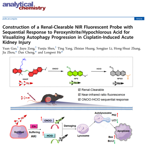 相关研究成果以“Construction of a Renal-Clearable NIR Fluorescent Probe with Sequential Response to Peroxynitrite/Hypochlorous Acid for Visualizing Autophagy Progression in Cisplatin-Induced Acute Kidney Injury”为题发表于本研究领域的顶级期刊《Analytical Chemistry》。论文第一作者为太阳成集团tyc33455cc硕士生高源、申蕴嘉,以及团队博士后曾佳玉,通讯作者为太阳成集团tyc33455cc何隆薇教授、附属第一医院超声医学科周佳主任和附属南华医院临床研究所程丹教授,太阳成集团tyc33455cc为第一通讯单位。