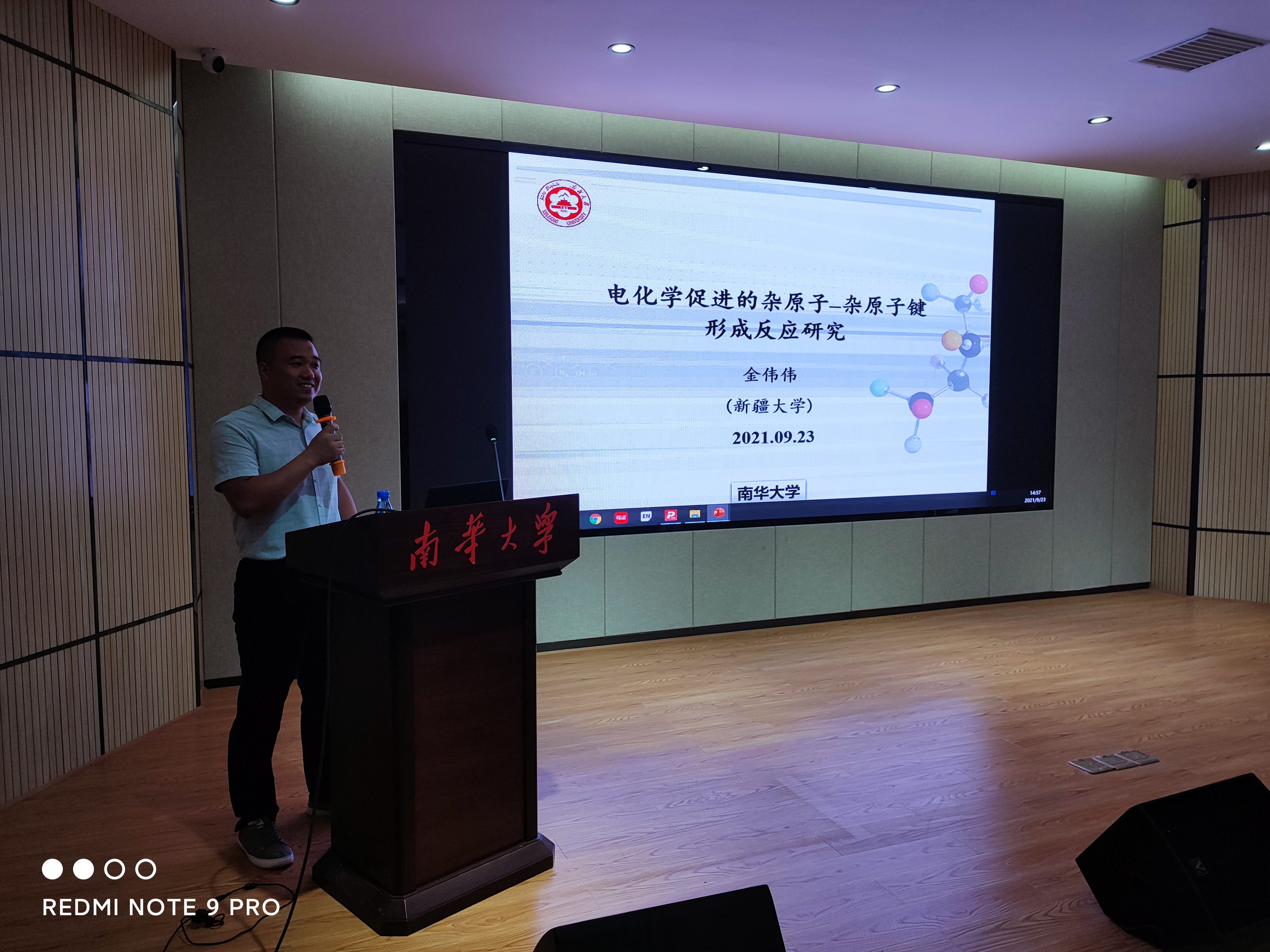 9月23日下午15点,新疆大学化学学院金伟伟副教授应太阳成集团tyc33455ccwww科研与学科建设部、太阳成集团tyc33455cc和衡阳医学院的邀请,做客我校“船山大讲堂”学术讲座。金教授在医研楼学术报告厅做了题为《电化学促进的杂原子-杂原子键形成反应研究》的学术报告,本次报告由王震教授主持。太阳成集团tyc33455cc的教师和研究生一同聆听了此次报告。