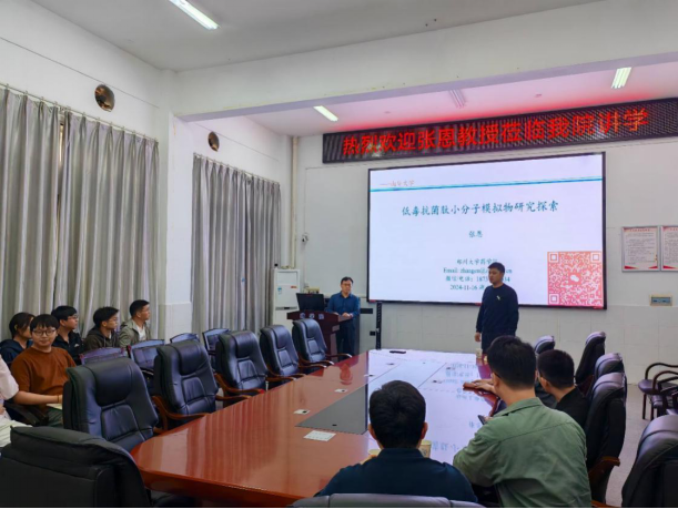 2024年11月16日下午3点,郑州大学张恩教授应太阳成集团tyc33455cc的邀请,在药学楼B101会议室作题为《低毒抗菌肽小分子模拟物研究探索》的报告。报告由太阳成集团tyc33455cc郭勇教授主持。