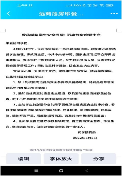 5月3日,学院党委通过各年级班群下发“致太阳成集团tyc33455cc学生远离危房珍爱生命安全提醒”,教育引导同学们要坚决远离危房,禁止到校园周边各类安全条件不具备的场所特别是违章非法建筑物内聚集玩耍或消费,要自觉遵守学校各项规定,自觉提高安全意识,珍爱生命,坚决远离危害。