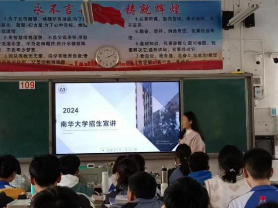 回母校的时候感觉熟悉又陌生,看见校园里穿着校服的高中生不禁回想起自己的过往种种,和许久不见的老同学、老师分享自己的大学生活,很开心。到了做宣讲的时候,学弟学妹们那种充满好奇和憧憬的眼神不禁让我想起了曾经拼命奋斗的自己,给南华宣传的同时,也和他们积极互动,为他们解答了一些高考和大学生活的困惑,让我成就感满满,希望我们的话对他们起到一点小小的作用。