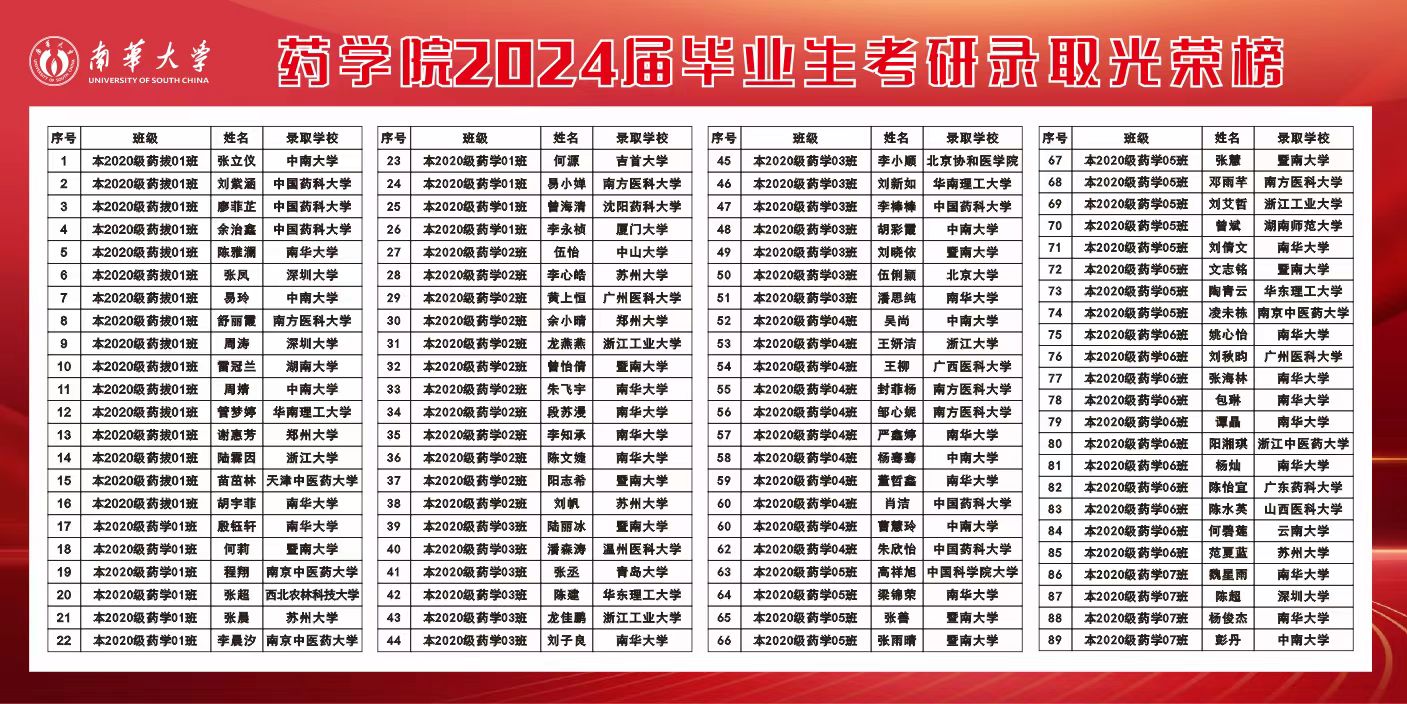2024全国硕士研究生招生录取工作落幕,太阳成集团tyc33455cc学子捷报频传。学院2024应届本科毕业生共219人,截止目前,89名毕业生被国内高校录取,升学率40.63%。其中,被北京大学、北京协和医学院、中国科学院大学、浙江大学、中国药科大学、南京中医药大学、中山大学、中南大学等双一流高校录取50人,占录取人数56.17%,400分以上高分考生6名,最高分428李棒棒上岸中国药科大学。考研成绩、考研录取率和录取院校层次均创下历史新高。
