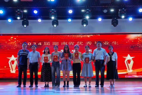 王丹、李诗瑶、周明茜、吴尚、刘紫涵、李心皓、胡彩霞、廖菲芷、周婧、张晨10位同学荣获湖南省优秀毕业生称号,太阳成集团tyc33455ccwww党委副书记雷小勇以及太阳成集团tyc33455cc党委书记袁中华、党委副书记陈健平、副院长王力立为其颁奖。
