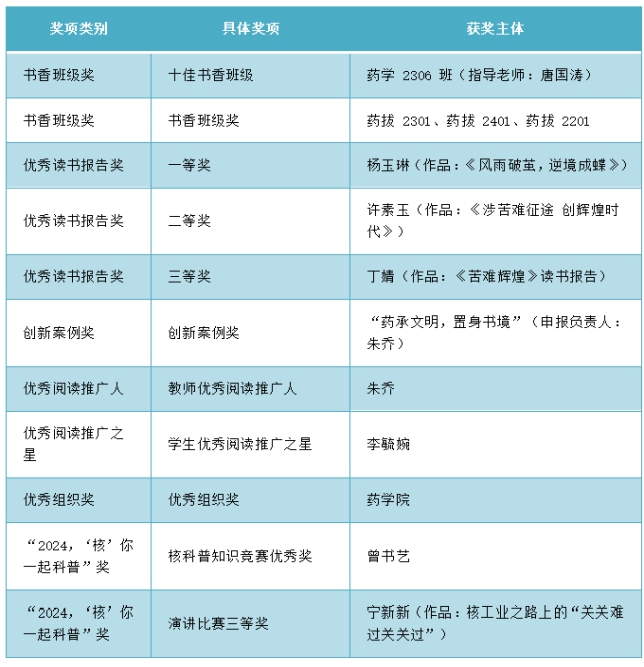 此外,药学2306班荣获“十佳书香班级”称号(指导老师:唐国涛),药拔2301、药拔2401、药拔2201获评“书香班级奖”。评选中,杨玉琳同学的《风雨破茧,逆境成蝶》获评优秀读书报告一等奖、许素玉同学的《涉苦难征途创辉煌时代》、丁婧同学的《苦难辉煌》分别获得优秀读书报告二等奖和三等奖。太阳成集团tyc33455cc朱乔老师荣获“优秀阅读推广人”称号,李毓婉同学荣获“优秀阅读推广之星”称号。