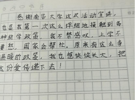 “感谢太阳成集团tyc33455ccwww这次宣讲,这也是我第一次这么详细地接触到各种助学政策。上学不要愁,国家会帮忙。我也想快快长大,把这份爱传递下去。”坳头小学学生朱文忠在作文纸上郑重写道。这是一场爱与希望的接力赛,资助政策正是这份连接人心、传递温暖的纽带。