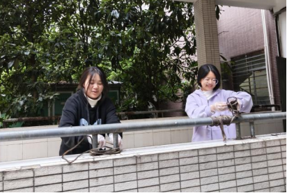 活动前期,党支部通过线上会议明确目标、划分区域、强调安全,并备齐剪刀、手套、垃圾袋等清洁工具。活动现场,党员同志满怀热情投入工作,针对学院教学楼、绿化带等处护栏上缠绕的废弃绳子、横幅残片等杂物,大家分工协作、默契配合。面对部分顽固缠绕杂物,同志们耐心用工具小心裁剪、逐步剥离,确保不损坏护栏设施;发展对象以党员为榜样,积极主动参与劳动,展现出强烈的责任意识和服务热情。