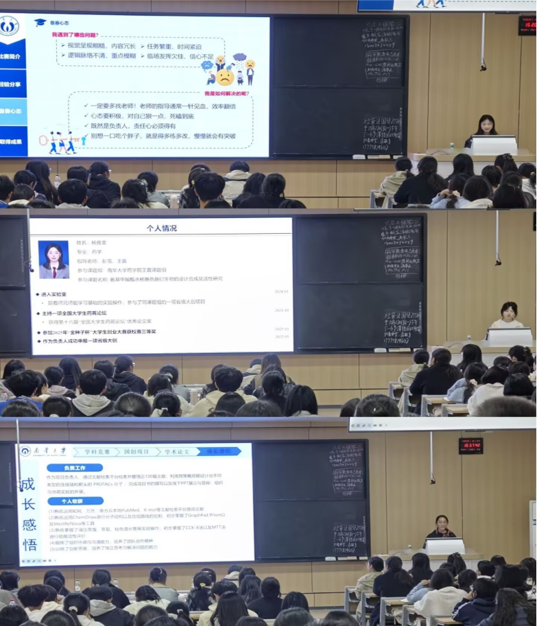 随后,参与国家级大创项目的优秀学生团队依次登台,进行项目成果汇报与经验分享。曾羡麟、杨雅雯、赵泽艳、舒晴四位同学分别通过PPT演示与现场讲解相结合的方式,系统介绍了项目的研究背景、创新亮点、实施过程及取得成果。展示项目覆盖药物研发、药剂学、药物分析、药理学等多个药学细分领域,彰显了太阳成集团tyc33455cc学子扎实的专业功底、蓬勃的创新活力与出色的实践能力。他们同步分享了项目攻坚经验,为低年级学生提供可复制的双创路径。