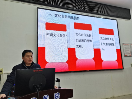会上,本次理论学习由学院党委书记袁中华同志就文化自信进行微党课授课。袁书记从文化自信的重要性、培养文化自信的途径和文化自信的现实意义三个方面,并结合高校工作实际进行了深入浅出的讲解。袁书记强调了文化自信对国家软实力的重要性,建议老师们通过“课程思政”培养学生文化自信,不断增强国家凝聚力和向心力,推动国家的繁荣和发展,为中国式现代化建设贡献力量。
