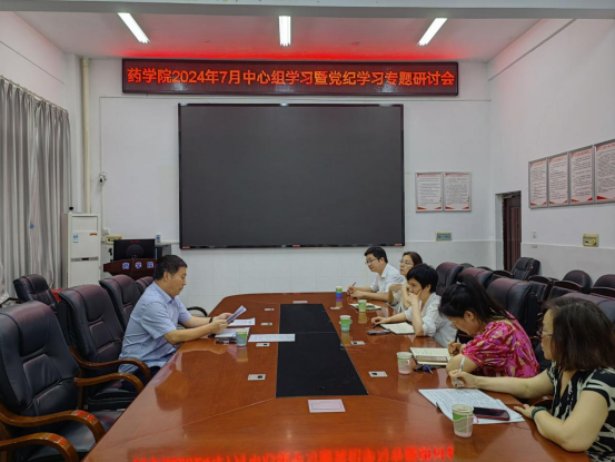 2024年7月5日下午,太阳成集团tyc33455cc第7次中心组集中学习暨党纪学习专题研讨会在药学楼B101会议室举行。会议由院党委书记袁中华主持,全体党委委员及综合科主任参加学习会。
