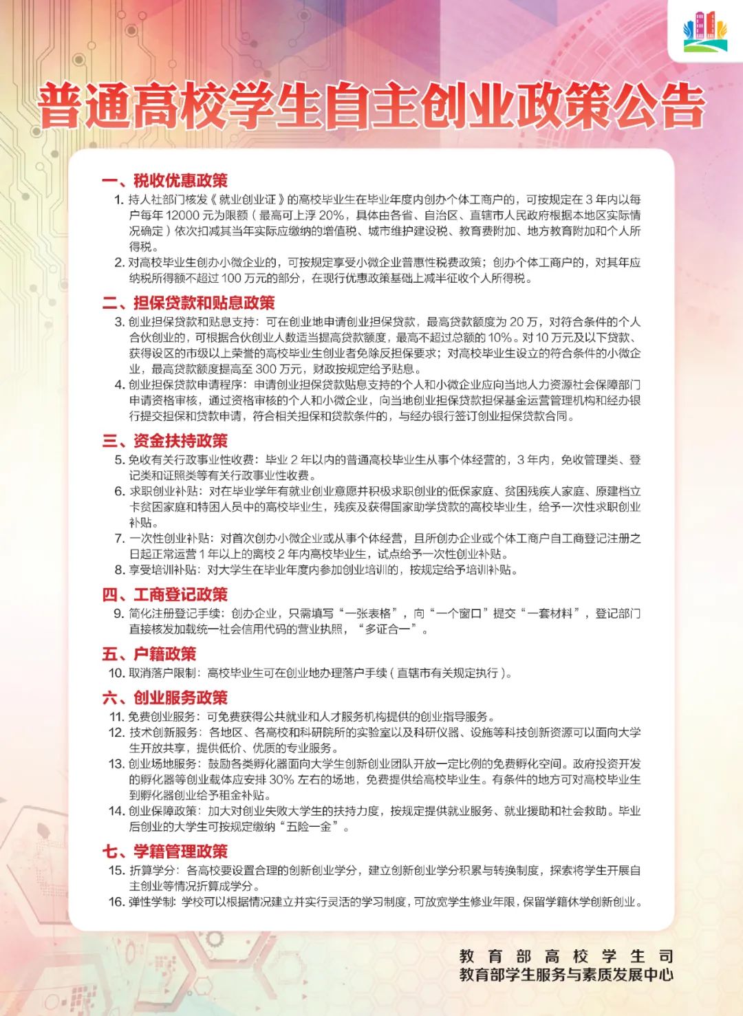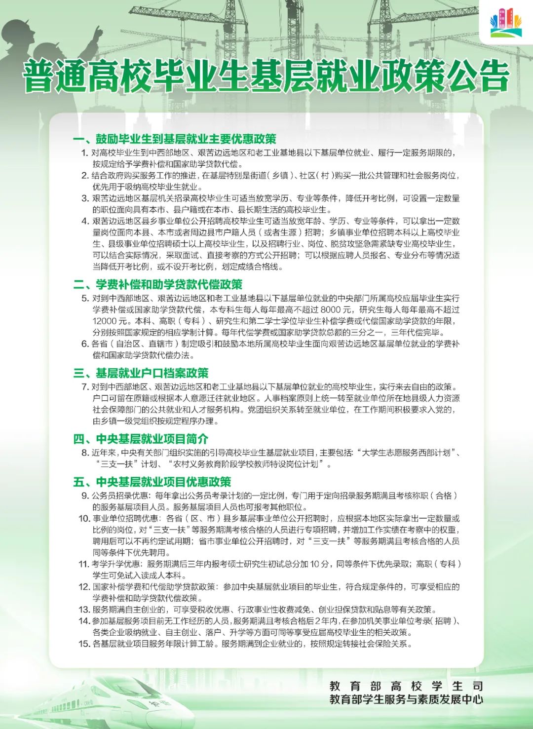 高校毕业生就业创业、应征入伍关系千万家庭幸福,关系财富创造、高质量发展,都有哪些好政策好服务来支持?这些你都知道了吗?请收好这份由教育部高校学生司、教育部学生服务与素质发展中心发布的普通高校毕业生基层就业政策、普通高校学生自主创业政策、普通高校学生应征入伍政策、普通高校毕业生就业服务政策。超给力的政策措施,随时随地掌握!