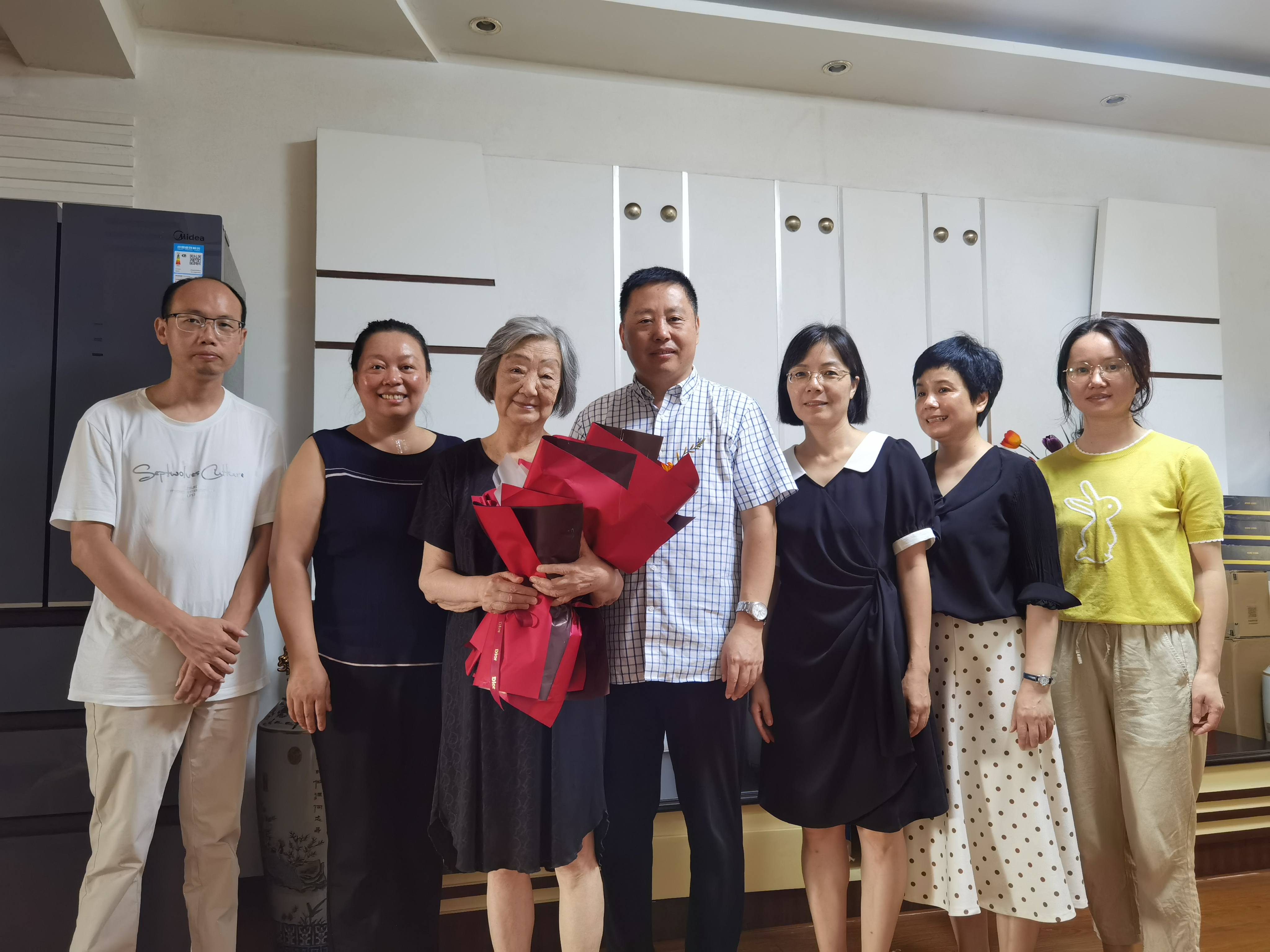 袁中华代表学院送上了献花和节日的祝福,感谢余麟老师为学校和学院事业发展所作出的贡献。祝愿余麟老师保重身体,关心关注学院发展。最后,大家与余麟老师合影留念。