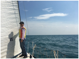 上图为校友唐宇生活工作照(左图:密歇根湖驾驶帆船出游;右图:组织小型学术报告会)