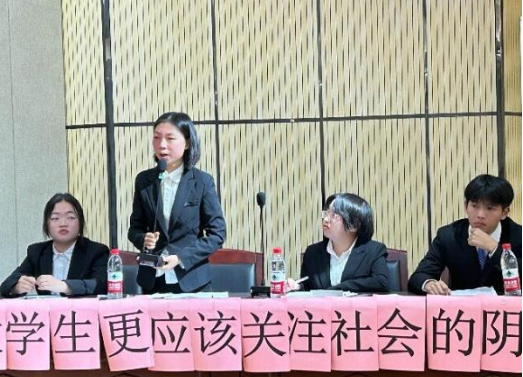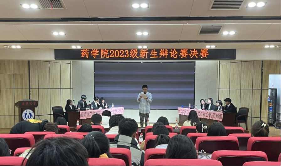 本次决赛共分为上下两场。上半场为季军争夺赛,由持“大学生更应该关注社会的光明面”观点的正方23级药学3班与持“大学生更应该关注社会的黑暗面”观点的反方23级药学7班展开辩论。双方皆以良好的风范、出色的口才、敏捷的思维令在场观众为之折服,掌声不断。最终,反方23级药学7班获得胜利,最佳辩手为正方四辩2303班刘淇。