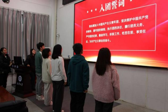 入团仪式在庄严的国歌声中正式拉开序幕。随着新团员名单宣读,由李馨然带领张佩等四名新团员佩戴团徽,庄严宣誓。随后,主持人向贞虹宣读《中国共产主义青年团章程》中有关团员的义务与权利的相关条款,带领新团员了解自身职责所在,牢记初心使命。